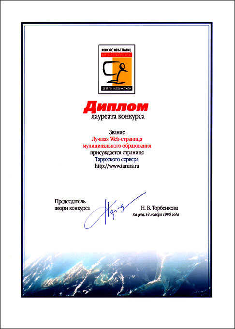 Конкурс: "Виртуальные ресурсы Калужской области". Дата проведения: с 1 августа по 31 октября 1998 г. Диплом лауреата конкурса: "Лучшая Web-страница муниципального образования".