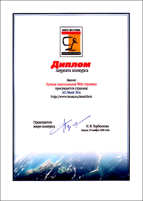 Конкурс: "Виртуальные ресурсы Калужской области". Дата проведения: с 1 августа по 31 октября 1998 г. Диплом лауреата конкурса: "Лучшая персональная Web-страница".